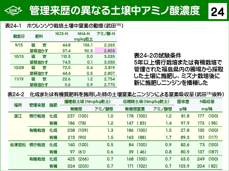 福島農総セの武田19)は、未耕地黒ぼく土に無機肥料(硫安)または有機質肥料(菜種油かす)を施用し、ホウレンソウを栽培しました。ホウレンソウの生育量には差が無く、窒素吸収量は無機区に比べ有機質肥料区で減少し、ホウレンソウ体内のアミノ酸濃度を高めるほどではありませんでした。9月1日に窒素で14mg/100g土壌相当の施肥を行い、土壌中の窒素動態を調べました。その結果、硝酸態窒素は常に硫安区で高く推移し、アミノ酸態窒素は施肥後2週間後の9月15日には有機質肥料区で僅かに高くなっていますが、概ね無機、有機の差はありませんでした(表24-1)。